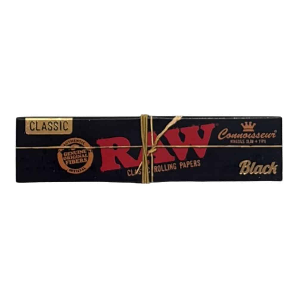 נייר גלגול RAW Black Connoisseur King Size Slim מסדרת Classic כולל ניירות דקים במיוחד ופילטרים תואמים בחבילת קומבו קומפקטית עם גומייה לסגירה נוחה. עשוי מסיבים טבעיים ומעניק חוויית גלגול עדינה, מדויקת ואיכותית.