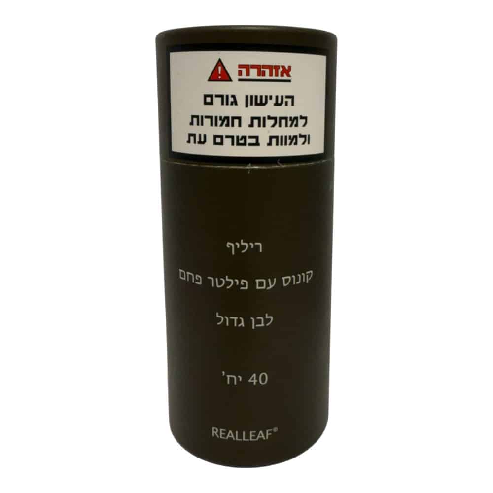 קונוסים ריליף לבן מבית REALEAF כוללים 40 קונוסים מוכנים בגודל קינג סייז בקופסה קשיחה. עשויים נייר לבן עם פילטר פחם מובנה לסינון משופר. מתאימים למילוי מהיר ונוח בבית או בדרכים.